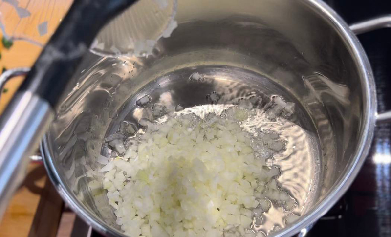 Curățăm morcovul de coajă și tocăm ceapa în cubulețe mici. Dăm morcovul curățat pe răzătoare, pe partea fină. Adăugăm ulei într-o oală și călim ceapa. Când ceapa are culoarea