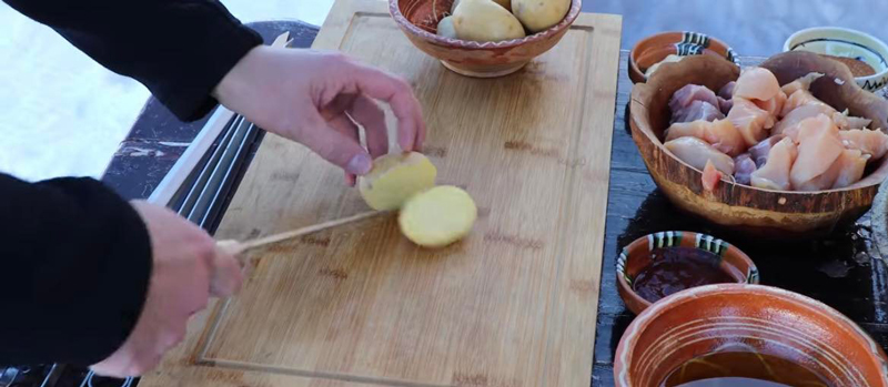 Dovlecii se taie pe lungime apoi se taie în bucăți de 4-5 cm. Cartofii, depinde de mărimea lor, se taie pe jumătate sau în patru.