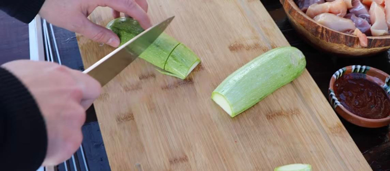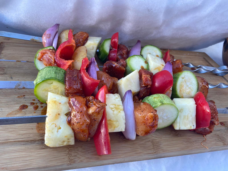 Cu o pensulă, am adăugat peste frigărui și legume marinada rămasă.