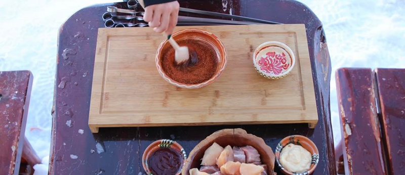 Se amestecă uleiul de măsline cu 3 linguri de coreiandru și chimen măcinat, se adaugă sare și piper după gust, după care se toarnă peste carne și se amestecă bine până ce marinada se încorporează în carne.