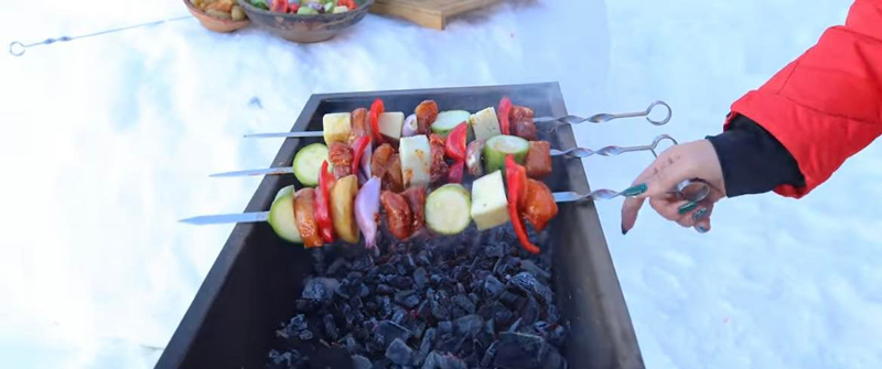Eu am folosit un grătar special pentru aceste frigărui și le-am prăjit la temperatura indirectă, la 25 cm față de cărbuni, le-am întors foarte des. Timpul de prăjire nu pot să-l zic, pentru că este diferit, în funcție de temperatura cărbunilor.