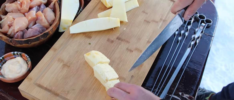 Se curăță mușchiulețul de pielițe, se taie în felii groase de 2-3 cm. Fileul de pui interior se taie pe jumătate.