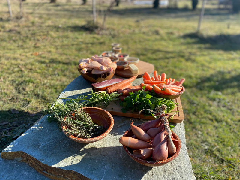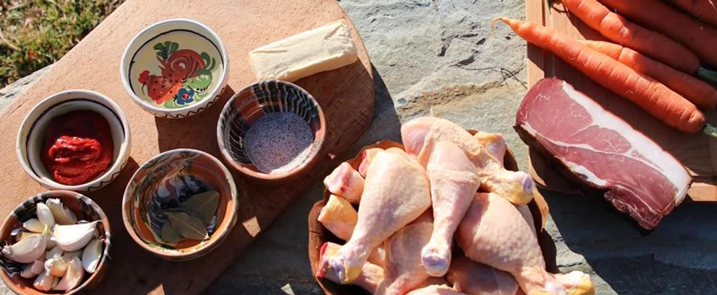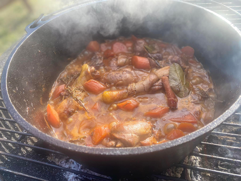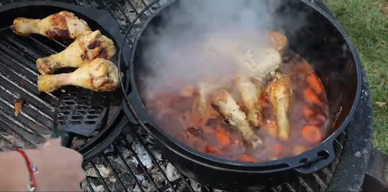 Stingem cu vin roşu vin, adăugăm supa de legume, pulpele de pui, condimentele şi se fierbe încet la foc mic aproximativ 90 de minute sau până carnea este moale.