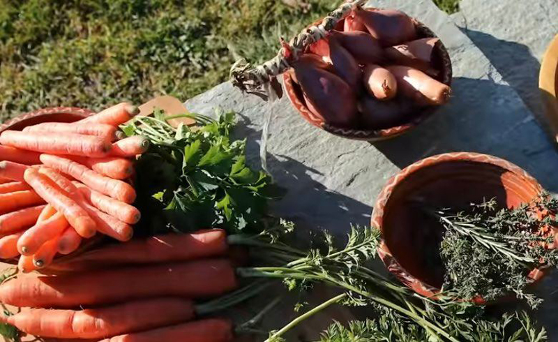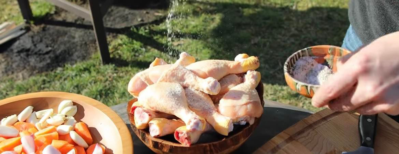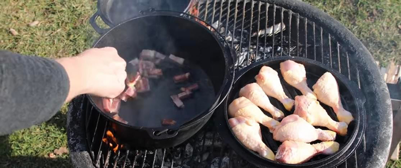 Încingem uleiul într-un ceaun sau cratiţă, adăugăm şunca de casă şi o prăjim până devine rumenă. Adaugăm legumele şi le prăjim pentru 5-7 minute amestecând periodic, între timp încingem uleiul într-o tigaie și prăjim pulpele de pui.