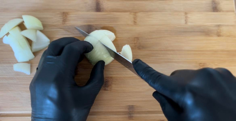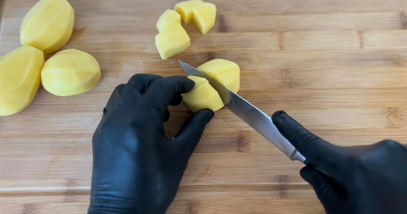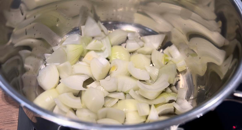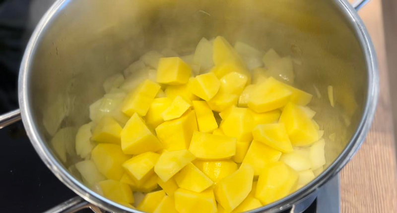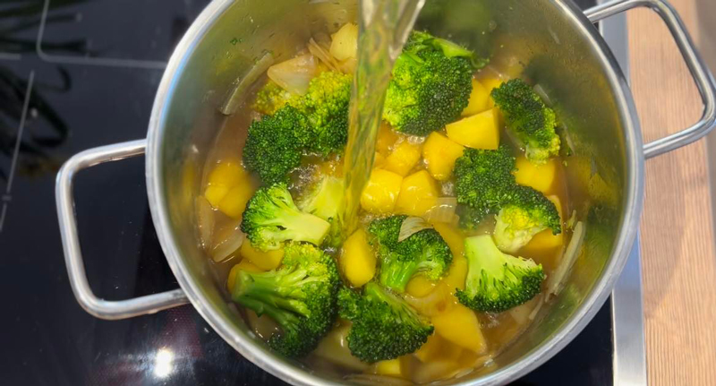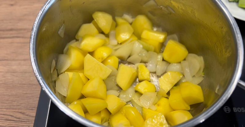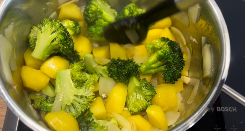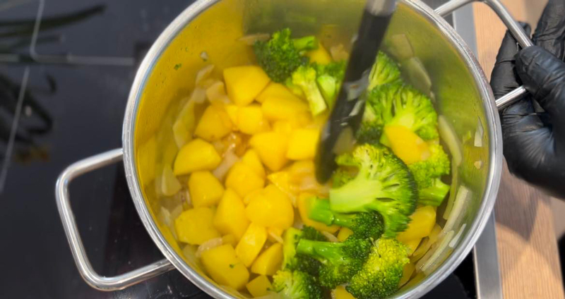 Călim ceapa, amestecăm, adăugăm cartofii și broccoli, lăsăm să se călească pentru câteva minute și amestecăm din când în când.