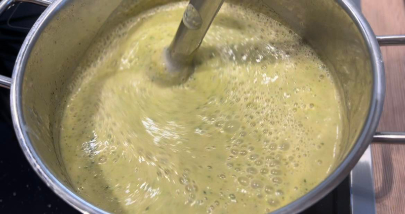 Se fierbe la foc mic, pentru aproximativ 20-25 de minute. Cu un blender de mână sau robot de bucătărie, mixăm totul. În cazul în care supa este prea groasă, mai adăugăm supă clară de legume.