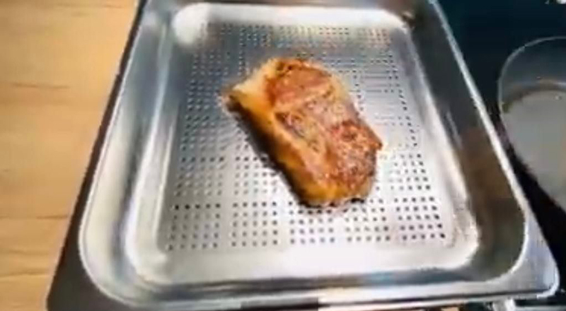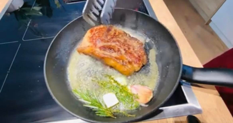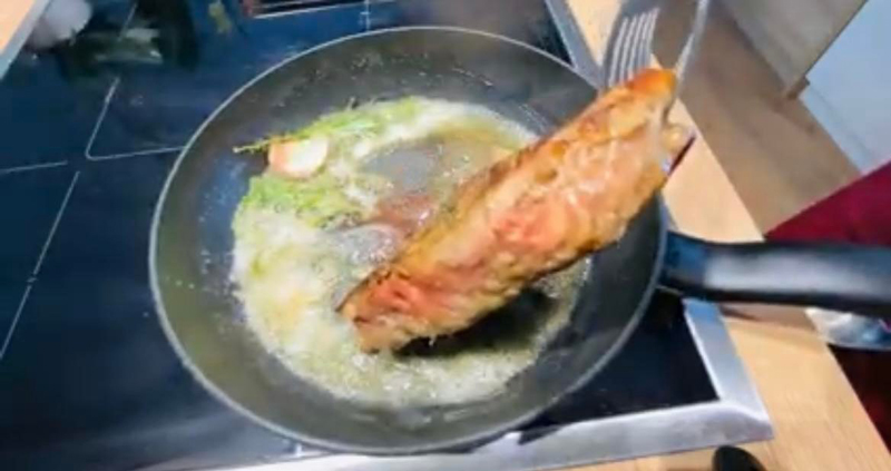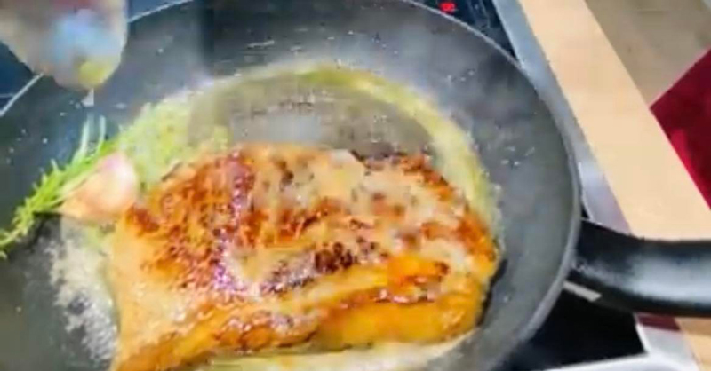 Scoatem vrăbioara de la cuptor o punem în tigaie şi cu o lingură adăugăm untul spumat peste friptură timp de 40 de secunde.