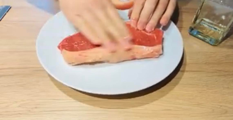 Turnăm puţin ulei de floarea soarelui sau de răpiță peste friptură şi o masăm timp de câteva secunde pe ambele părţi.