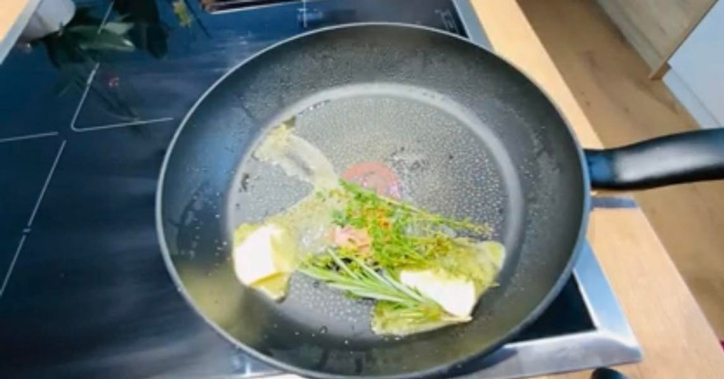 Într-o tigaie, adăugăm unt, crenguţă de rozmarin, cimbru, usturoi.