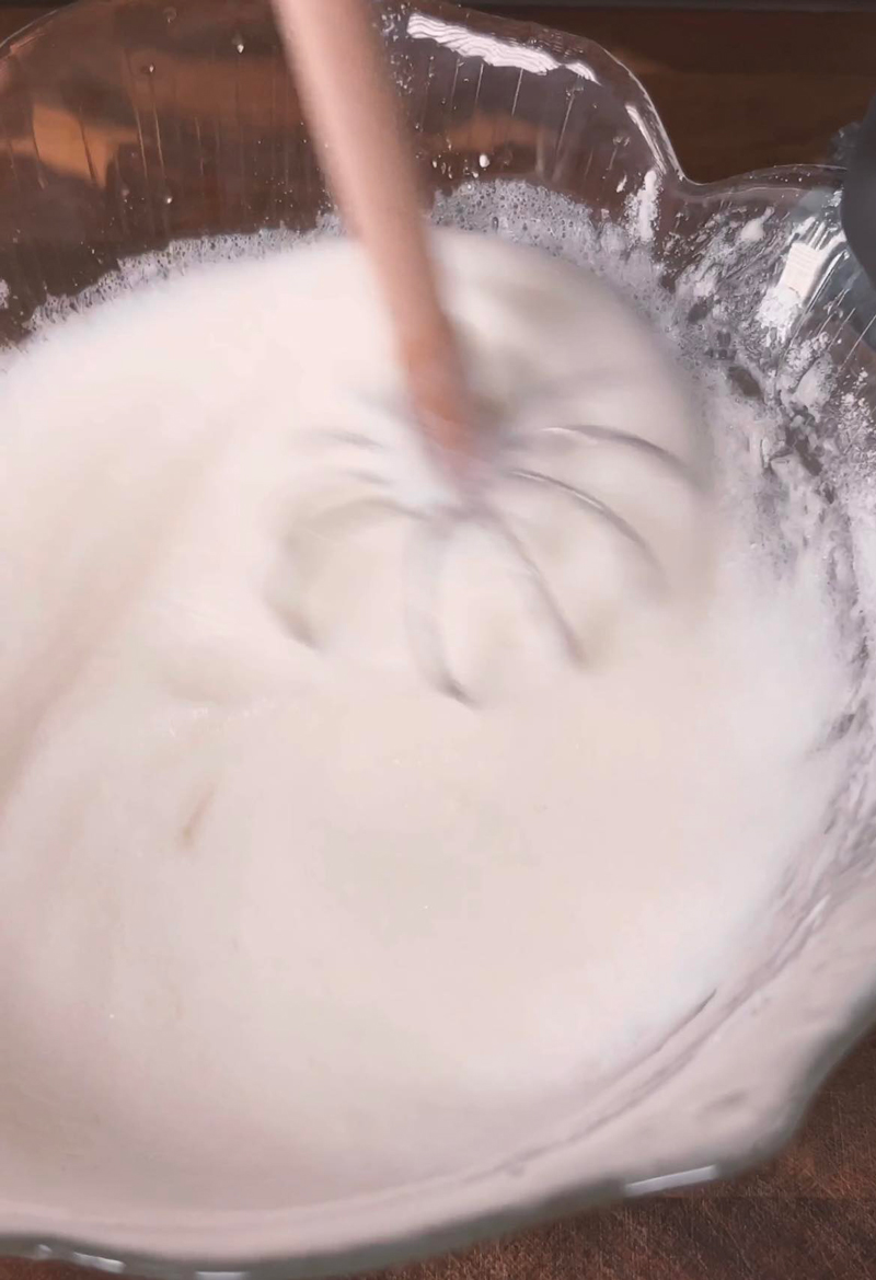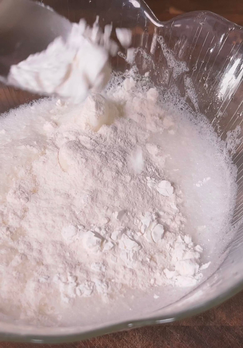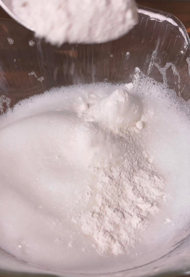 Între timp, într-un bol, adăugăm albușurile de ou, împreună cu sarea si amestecăm bine până când albușurile s-au transformat în spumă, adăugăm făina, amidonul și amestecăm până când totul s-a încorporat bine.