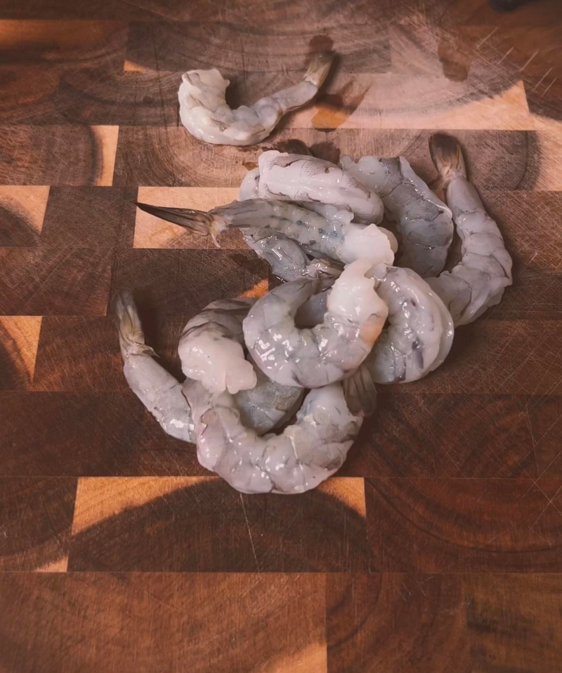 Curățăm creveții de solzi și le scoatem intestinul. Îi spălăm, apoi îi puneam pe un prosop din hârtie de bucătărie.