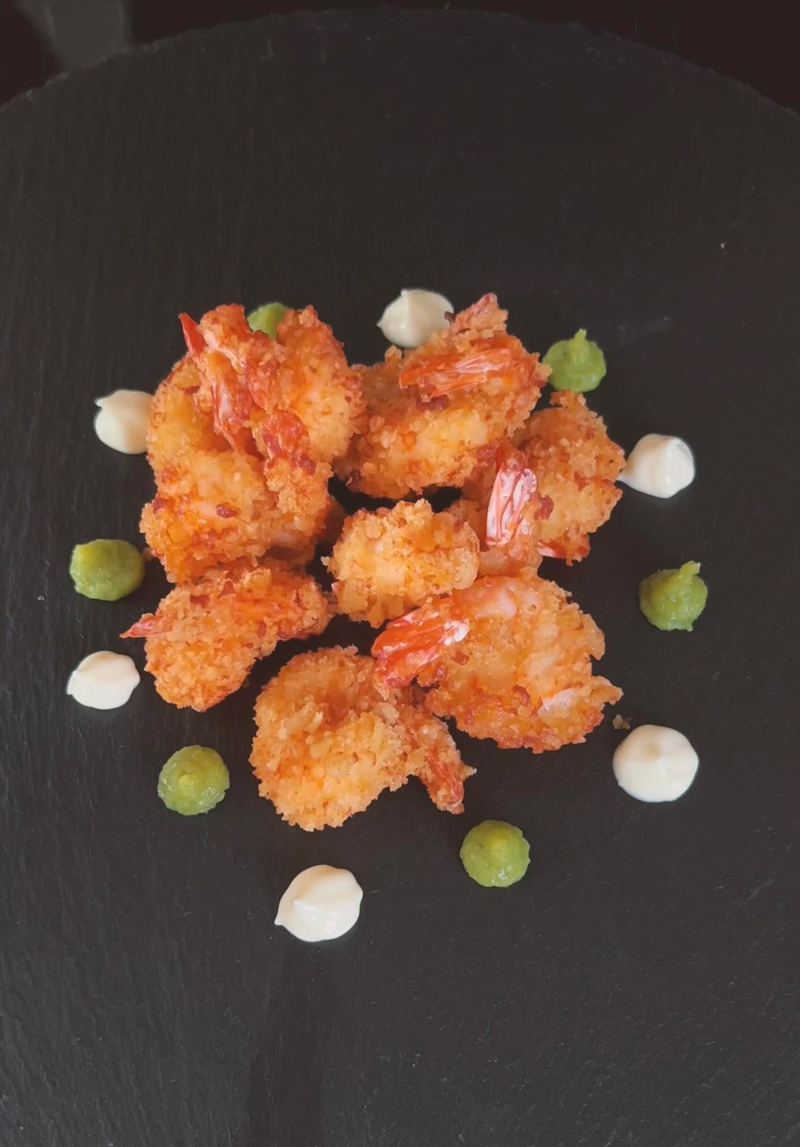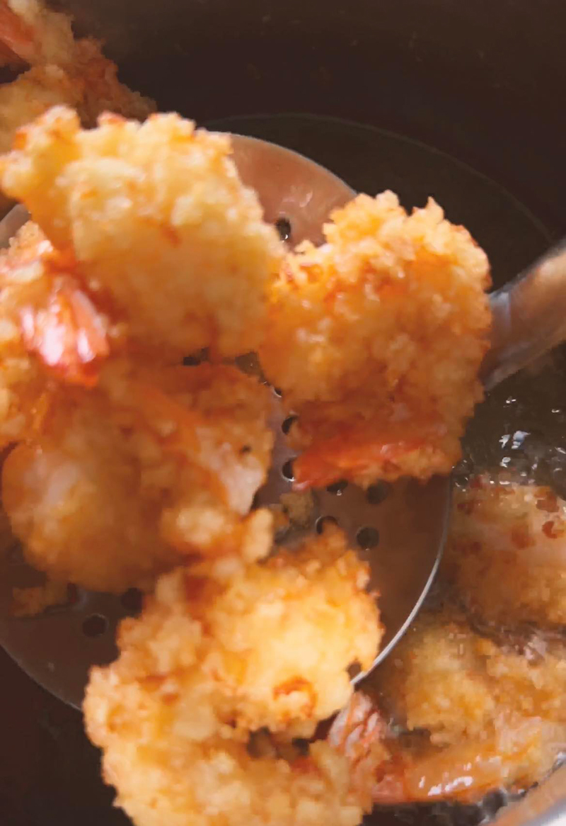Turnăm uleiul într-o cratiță și-l pregătim pentru a prăjii creveții. Introducem creveții, prima dată, în amestecul din albușurile de ou, apoi în pesmetul Panko și-i prăjim în ulei până ajung la o culoare aurie.