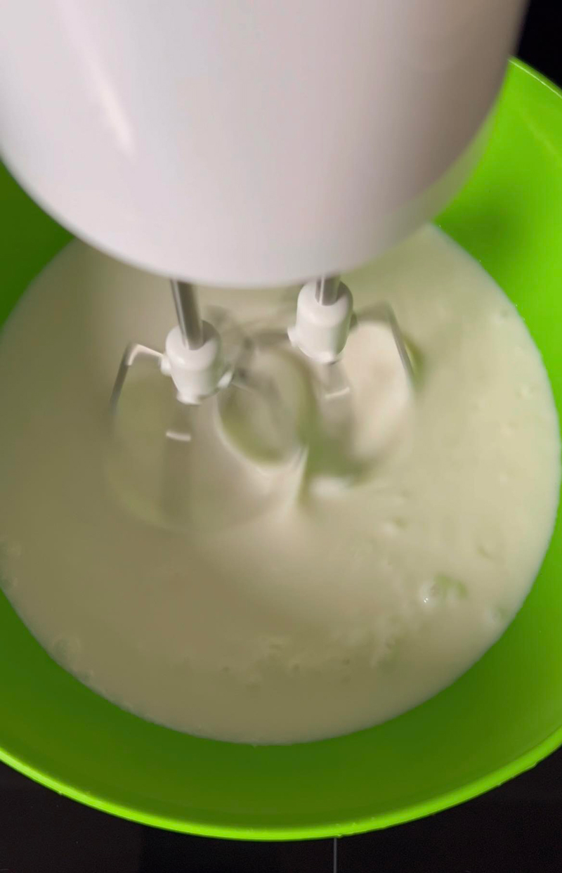 Într-un bol, cu un mixer de mână, amestecăm laptele de cocos până obținem un amestec omogen.