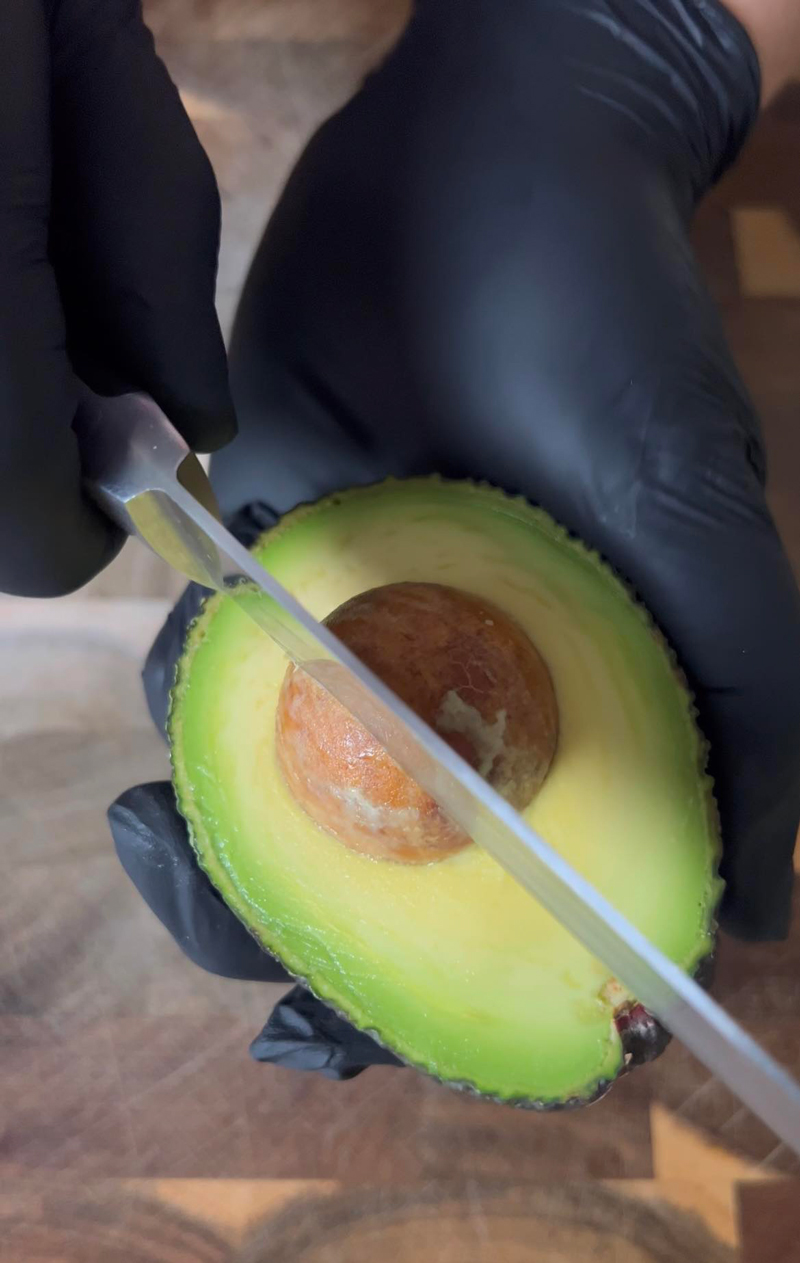 Tăiem avocado pe jumătate, îndepărtăm sâmburele, iar, cu o lingură, scobim și miezul îl punem într-un blender.