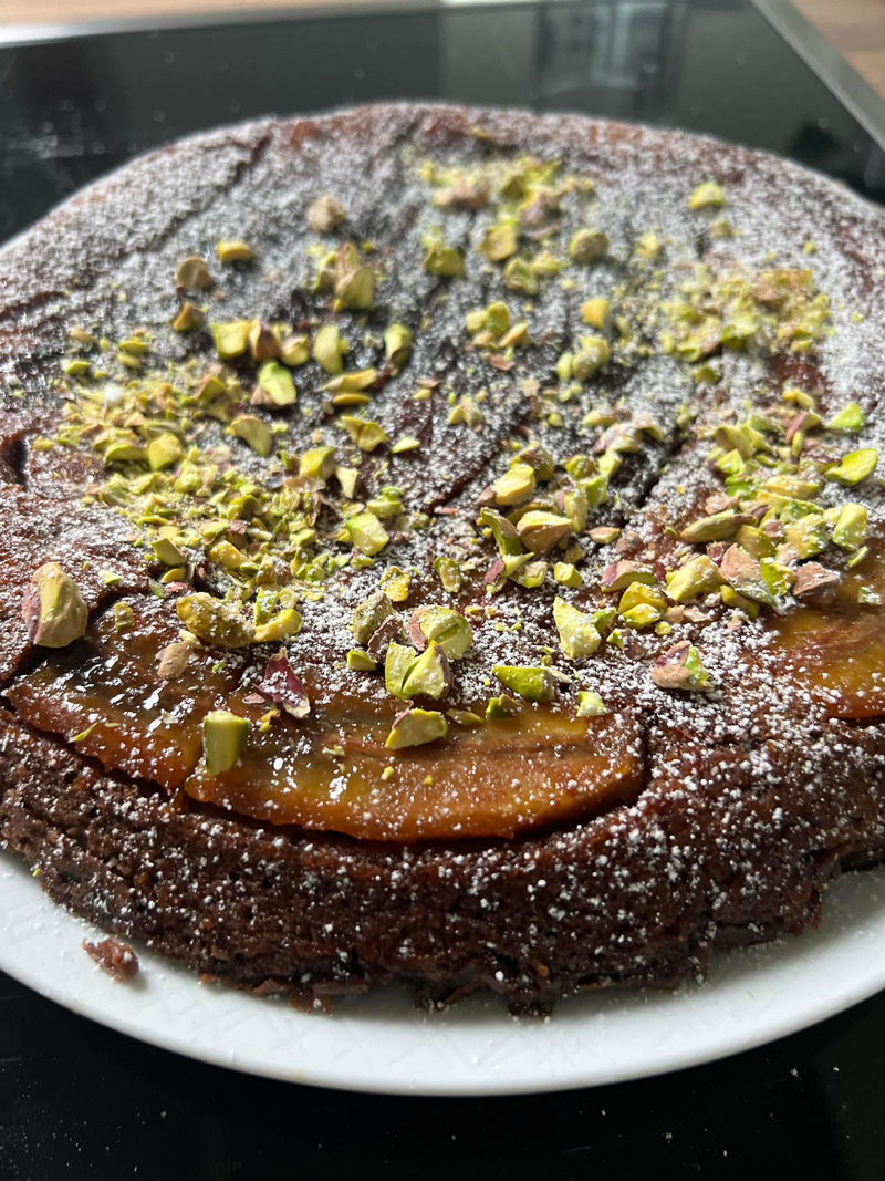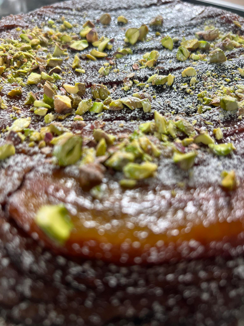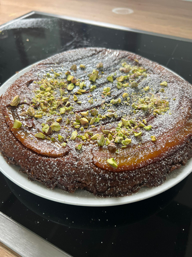 Totuși, după 15 minute, recomandarea mea este să se încerce blatul cu o scobitoare. Răsturnăm prăjitura pe o farfurie iar dacă este nevoie o punem din nou în tigaie pentru 5 minute pentru a se coace și pe partea cealaltă Servim prăjitura cu fistic sfărâmițat și zahăr pudră deasupra!