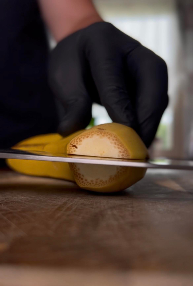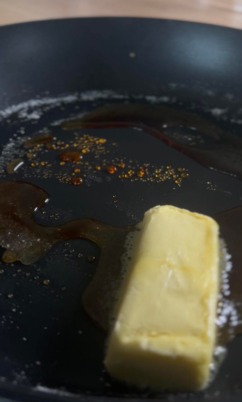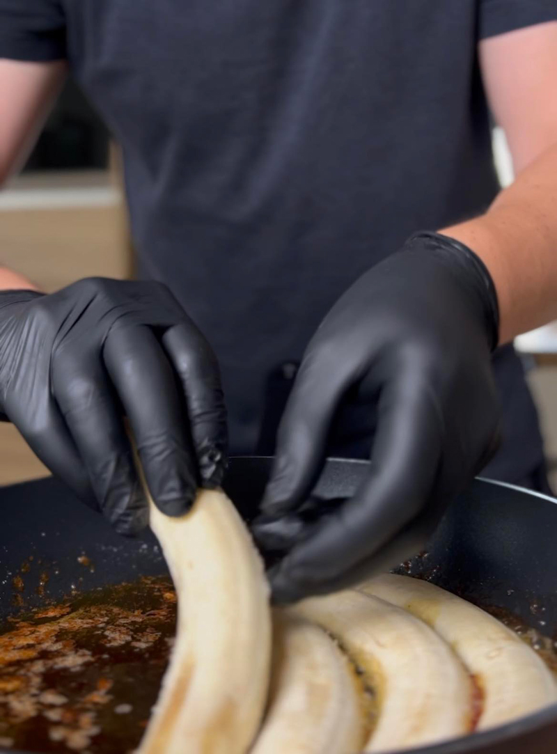 Tăiem bananele, pe lungime, în două și indepărtăm cojile. Într-o tigaie, cu diametrul de 28 de cm, adăugăm puțin zahăr, apoi lăsăm zahărul să se caramelizeze ușor, adăugăm untul, apoi bananele și reducem temperatura aragazului la minim.