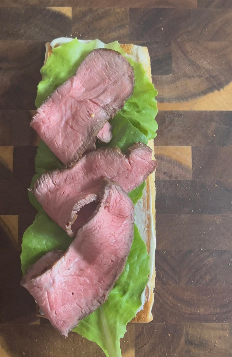 Ungem felia de pâine cu maioneză, sau cu pasta de avocado – după caz, adăugăm salata, apoi tăiem carnea în bucăți lungi și subțiri.