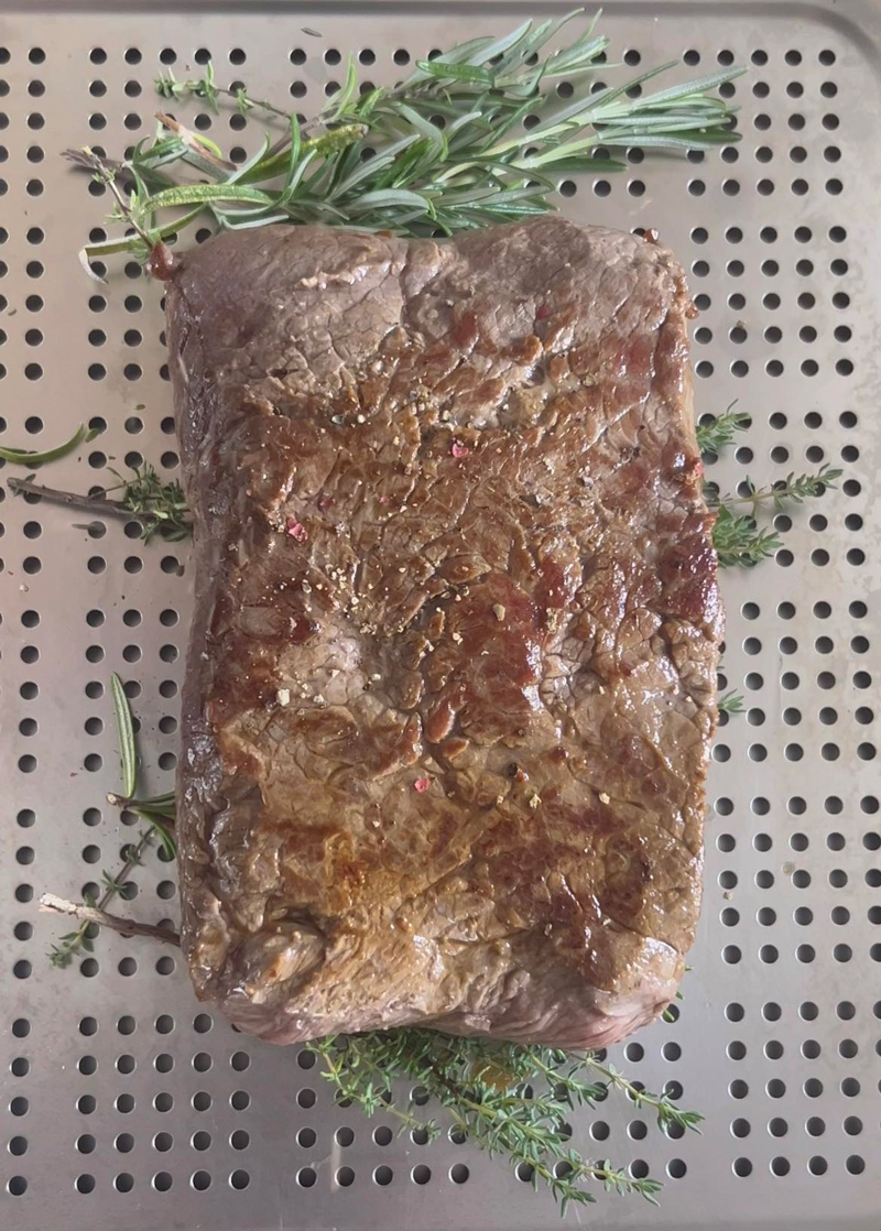 Adăugăm uleiul într-o tigaie și prăjim carnea scurt, la temperatură ridicată, pe toate părțile, mai exact o sigilăm sau îi dăm ,,față”. Depinde de tigaie sau aragaz, fiindcă această operațiune trebuie să dureze aproximativ 5 minute. Pe o tavă aranjăm ramurile de cimbru și rozmarin.