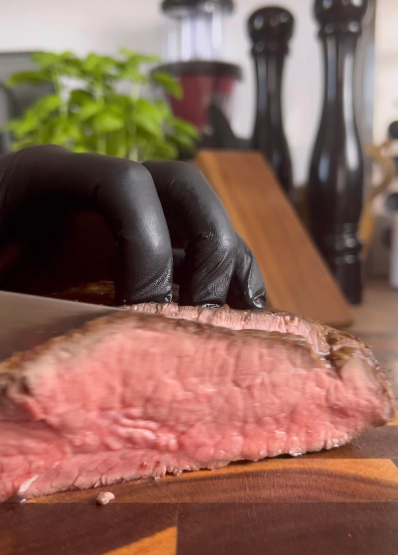 După ce carnea a atins temperatura interioară de 58 de grade, oprim cuptorul și lăsăm carnea, cu ușa deschisă a aragazului, să se odihnească minimum 10 minute. În acest fel, au timp fibrele musculare să se relaxeze înainte să tăiem carnea.
