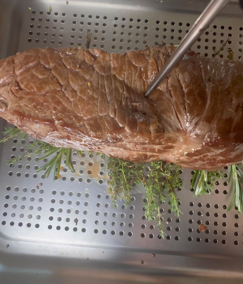 Pentru această rețetă este nevoie de un termometru pentru că temperatura interioară a cărnii trebuie să aibă 58 de grade.