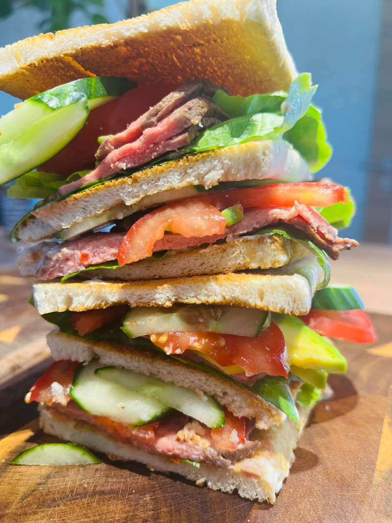 Peste carne adăugăm, castravete, roșii, avocado, punem capacul, mai exact, tot o felie de pâine toast, și ne bucuram de gustul unui sandviș inedit!