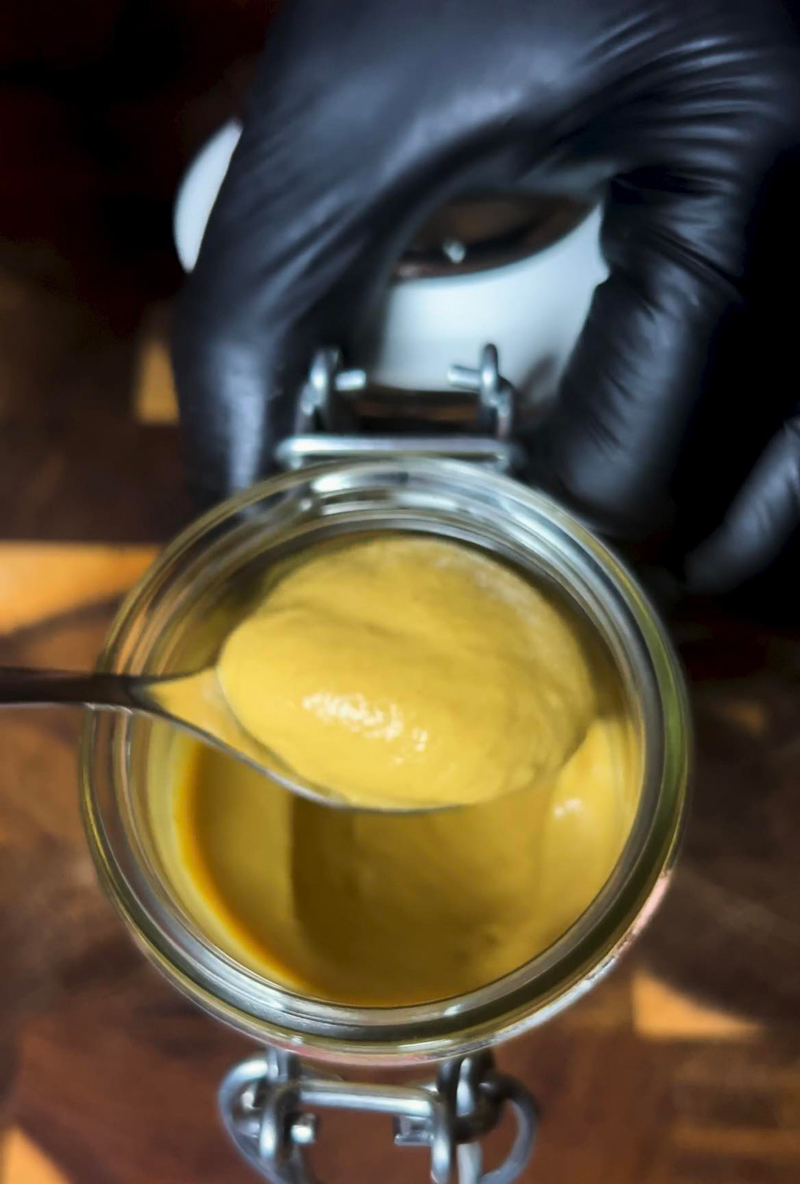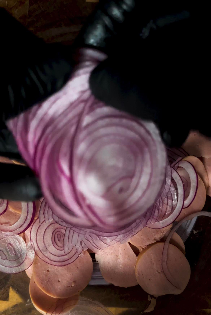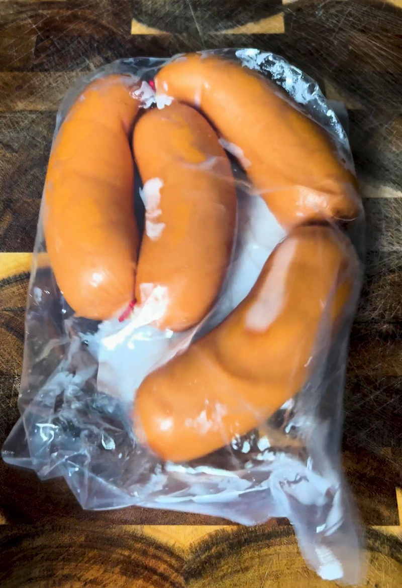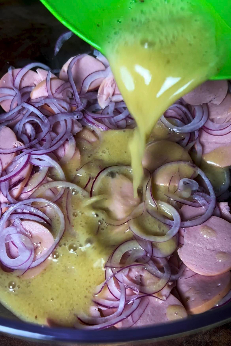 Este foarte important să folosim acest tip de cârnat ,,Knacker“, pentru că se îmbină foarte bine cu restul produselor. Curățăm cârnatul de piele, apoi îl tăiem feliuțe foarte subțiri. Eu am folosit o răzătoare cu un cuțit special, în așa fel încât, totul a mers mai repede.