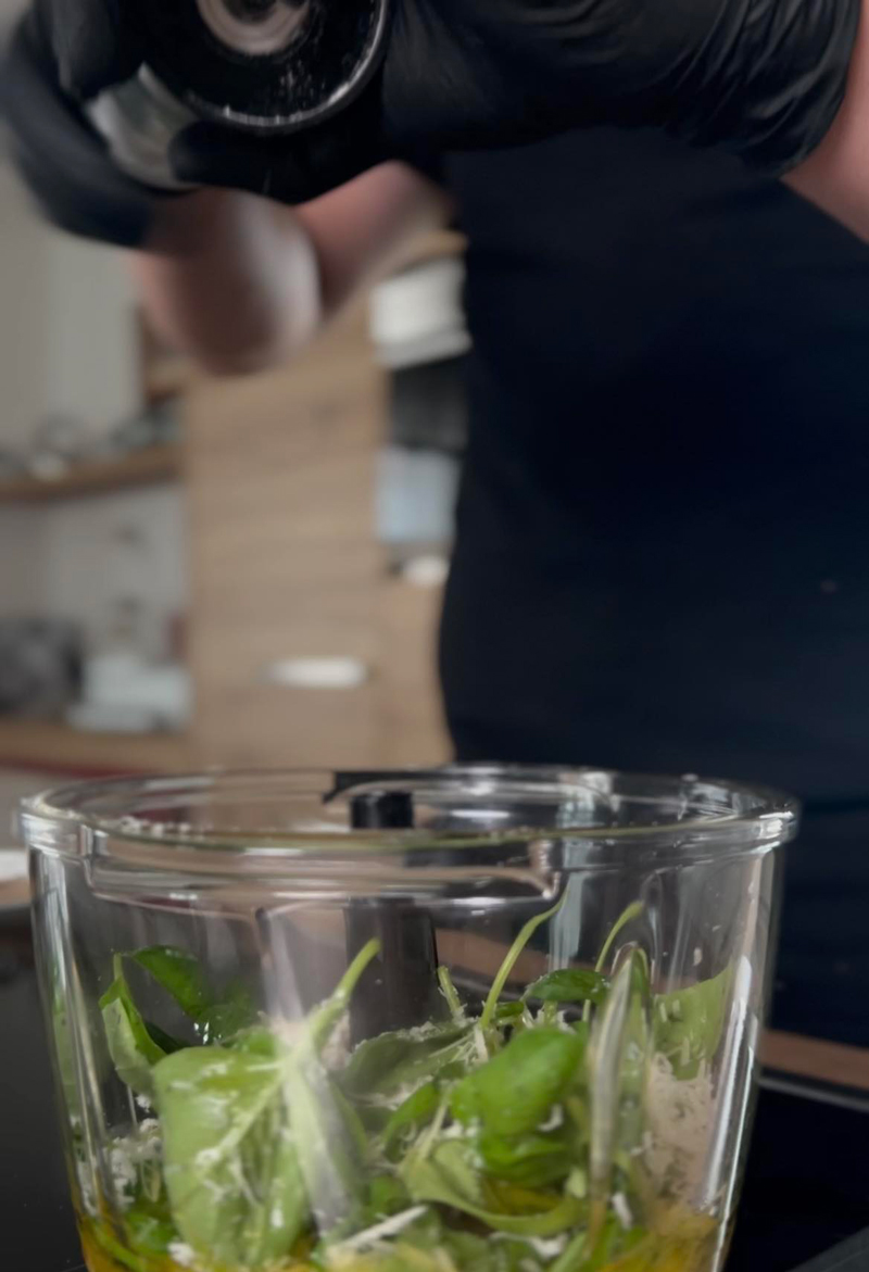 Într-un robot de bucătarie, adăugăm toate Ingredientele pe care le mixăm într-un sos fin. După gust, adăugăm sare dacă este nevoie, dar trebuie să avem în vedere că parmezanul este sărat, de aceea trebuie să fim atenți câtă sare punem. Acest sos Pesto se poate păstra în borcan, la frigider, sau poate fi servit imediat.