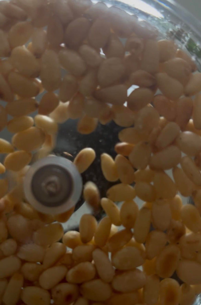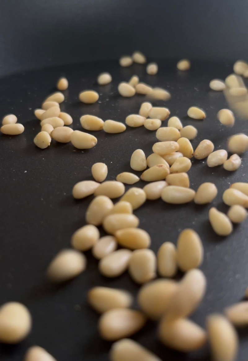 Sunt diferite rețete de acest sos Pesto, recunoscut în toată lumea. Eu vă voi prezenta rețeta cea mai simplă și gustoasă, care este gata în câteva minute. Punem mugurii de pin într-o tigaie și îi prăjim fără ulei până ajung să aibă o culoare aurie. Prin prăjire, mugurii de pin scot aroma și uleiul în evidență. Clătim rapid, sub jet, frunzele de busuioc, apoi le ștergem cu un prosop din hârtie de bucătărie. Radem parmezanul pe răzătoarea fină.