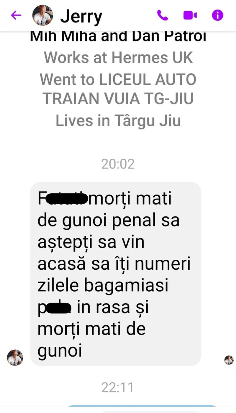 ,,F… morți mati de gunoi penal să astepti să vin acasa să îți numeri zilele bagamiași p…în rasa si morti mati de gunoi”. La scurt timp, bărbatul susține că a fost și sunat de aceeași persoană. ,,Mi-a zis că o să mă taie”, spune bărbatul.