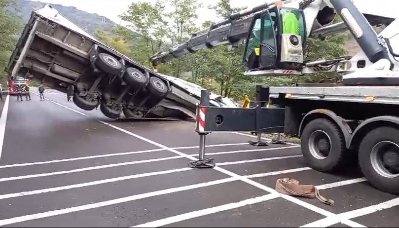Și la această oră, se lucrează pentru eliberarea carosabilului pe Valea Oltului, acolo unde un TIR s-a răsturnat, ajungând cu cabina într-o râpă și cu restul mașinii, de mare tonaj, pe șosea.