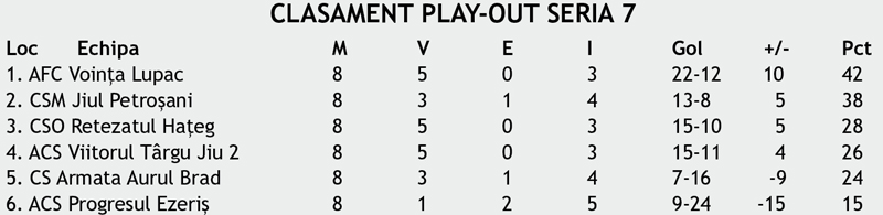 ,,Satelitul” Viitorului are șanse mari să rămână în Liga a 3-a după parcursul din ultima perioadă. Formația pregătită de Costel Andriucă a obținut patru victorii la rând și a scăpat de locul 5 din play-out, direct retrogradabil. Gorjenii au învins, în etapa a 8-a, formația Retezatul Hațeg, scor 2-1. Robert Dănescu (`5) și Vlad Buțurcă (`55) au marcat pentru gazde. Alexandru Lupulescu adusese egalarea în minutul 20. Cum sezonul în liga secundă s-a încheiat, trupa din eșalonul terț a beneficiat și de câțiva jucători de la prima echipă. În ultimele două runde, alb-albaștrii întâlnesc acasă ,,lanterna” Progresul Ezeriș și merg ,,în vizită” la Jiul Petroșani.