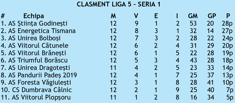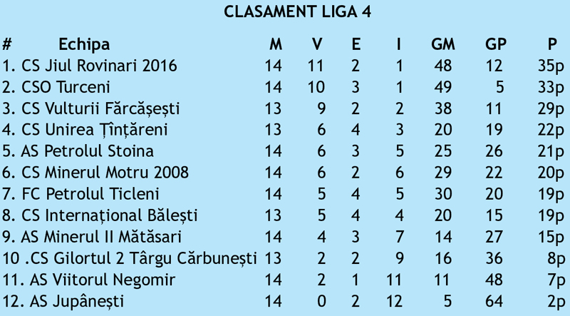 Jiul Rovinari a preluat șefia clasamentului de la CSO Turceni după runda cu numărul 16. Viitorul Negomir a produs surpriza etapei și s-a impus în fața campioanei în exercițiu. Antrenorul-jucător Ion Al-Ioani a semnat singura reușită a confruntării. Pe de altă parte, elevii lui Ion Lițoiu au câștigat la Motru și au acum două puncte avans în fruntea Ligii 4. Vulturii Fărcășești ține aproape după succesul cu Țicleni. În Liga 5, Știința Godinești și CSC Dănești conduc clasamentele, cu mențiunea că Energetica Tismana s-a apropiat la un singur punct de liderul Seriei 1, după victoria importantă din weekend.
