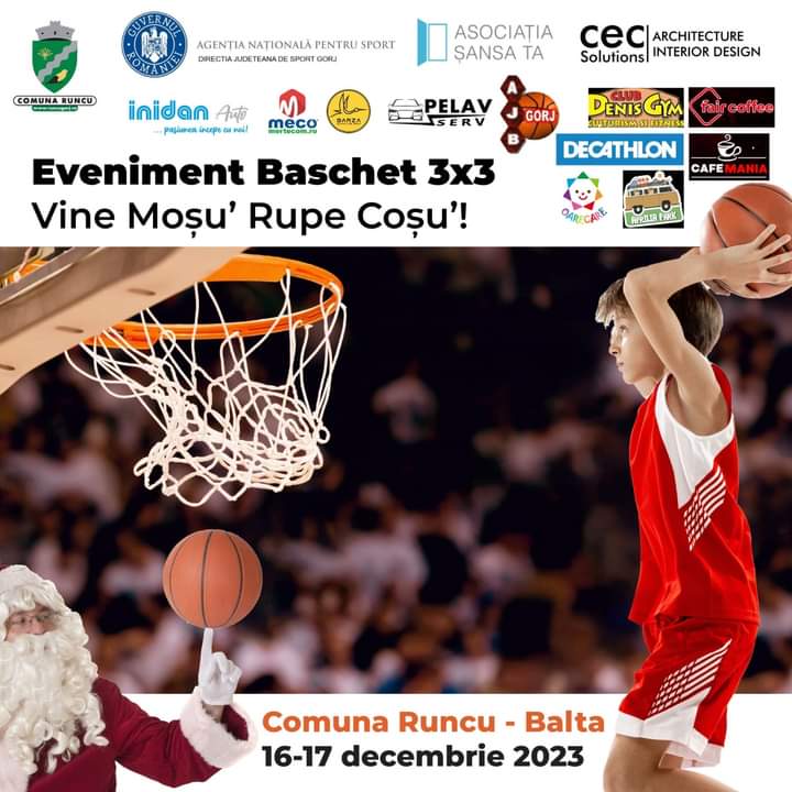 Un eveniment de amploare de baschet 3X3, dedicat copiilor din clasele V-XII, va avea loc la Runcu. “Vine Moșu’, Rupe Coșu’” se desfășoară pe 16 și 17 decembrie, sâmbătă și duminică, în Sala de Sport a Liceului “General Constantin Șandru” din satul Bâlta. Principalul organizator este ONG-ul “Gorj Aventura”, alături de parteneri (Primăria Comunei Runcu, Direcția de Sport și Tineret Gorj, Asociația Județeană de Baschet Gorj) și sponsori.