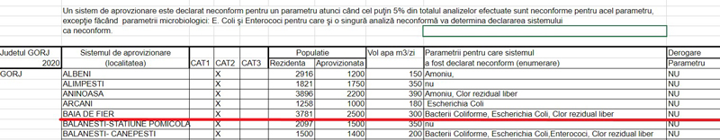 ,,Avem un virus sau ceva de genul pentru că foarte mulți din cunoscuții mei au diaree și vărsături și nimeni nu zice nimic”, a fost primul mesaj, postat de Laurențiu Tomoiu, urmat de zeci de comentarii în care oamenii spuneau că familii întregi au probleme similare dinainte de Crăciun. Părerea unanimă a celor din Baia de Fier este că problemele de sănătate ar putea fi cauzate de apa de la robinet și suspectau depășirea unor parametrii microbiologici, în contextul în care e de notorietate faptul că rețeaua de alimentare a comunei nu este conformă, iar apa nu e potabilă. ,,Toți cei care am fost la Baia de sărbători am avut de suferit, autoritățile ar trebui să ia măsuri, sigur există o sursa de contaminare, ar trebui testată apa, pe care, deși nu o consumăm, o folosim la menaj”, a scris Roxana. Oamenii afirmă că unii dintre ei au ajuns la spital la Novaci, iar medicii le-au confirmat că e vorba de un rotavirus. ,,Pe mine 8 zile m-a ținut. De două zile mă simt mai bine, dar a fost la fel, super balonată, vărsături, diaree…etc”; ,,Și eu am fost în aceeași situație 4 zile după care a urmat mama, 7 zile. Au fost chinuri și dureri îngrozitoare”, au scris alte două persoane care afirmă că în comună ar fi fost astfel de probleme la 20-30 de familii. Comuna Baia de Fier era menționată, într-un raport al DSP, în mai, anul trecut, printre localitățile care dețin sistem de alimentare cu apă, ,,având diferite deficiențe structurale și funcționale care nu asigură în rețea apa corespunzătoare legislației apei potabile”. Potrivit documentului menționat, intră în atribuțiile administrațiilor locale să analizeze situația existentă, să demareze și să realizeze programe de reabilitare și de modernizare a sistemelor de apă, pentru asigurarea la consumatori a apei corespunzătoare parametrilor naționali de potabilitate. ,,În conformitate cu Legea nr. 458/2002 , Serviciul de Sănătate Publică din cadrul DSP a comunicat operatorilor de apă și administrațiilor publice locale neconformitățile constatate și riscurile identificate în acțiunile de monitorizare a apei furnizate de instalații, dar și recomandări sanitare pentru conformarea calitativă a apei furnizate consumatorilor”, se menționează în raportul DSP Gorj. Baia de Fier face parte dintre localitățile al căror sistem de aprovizionare cu apă nu au deținut sau operatorii nu au vizat autorizațiile sanitare de funcționare, iar analizele de laborator au relevant faptul că apa prezenta bacterii Coliforme, E-Coli și Clor residual liber.