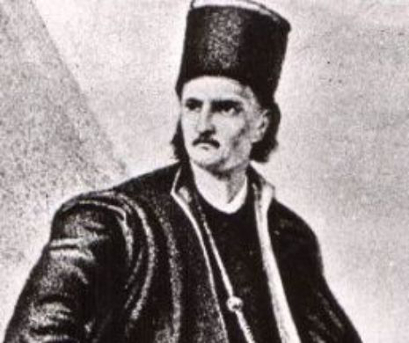 Cele douăsprezece trepte cioplite din blocuri de piatră, trepte ale istoriei, ne urcă până în fața „baldachinului” de piatră. Între cele două colonete, ca într-o nișă, privirea descoperă, ajutată de lumina soarelui ce atenuează răceala reliefului de bronz, chipul lui Tudor Vladimirescu, conducătorul Revoluției de la 1821. Nemulțumirea generală ajunsese, la sfârșitul celui de-al doilea deceniu al secolului al XIX-lea, atât de puternică încât nu era nevoie decât de scânteia care să determine aprinderea focului cel mare, de catalizatorul — cu un termen modern — care să declanșeze lanțul reacției în condițiile când toți ceilalți parametri existau. Era nevoie de un punct de pornire, era nevoie de un plan, era nevoie de un om, de un conducător în jurul căruia să se polarizeze energiile și tensiunile acumulate de masele populare care formau, de secole, „talpa țării”. Și dacă este adevărat că fiecare epocă își creează oamenii de care are nevoie, atunci se poate spune că și epoca începutului de istorie modernă românească și-a creat asemenea oameni, iar în fruntea lor împrejurările social-politice au așezat un om din popor, un reprezentant al păturii mijlocii a societății românești de la începutul veacului al XIX-lea, care, sintetizând năzuințele poporului spre emanciparea socială, era hotărât să stârpească abuzurile, să înlăture regimul fanariot din țară, să cucerească străvechile drepturi și libertăți ale poporului român. Se numea, omul acela, Tudor Vladimirescu. VOIEVODUL ȚĂRAN, cum l-a numit marele istoric Nicolae lorga. Și poate că nici un alt epitet, nici o altă descriere, oricât de amplă, n-ar fi reușit să caracterizeze mai bine pe conducătorul revoluției decât aceste două cuvinte asociate de o strălucită gândire și așternute de o inspirată pană. Ca un voievod ne privește, într-adevăr, Tudor, de pe prima placă de bronz care i se înfățișează celui ce vine să admire monumentul.