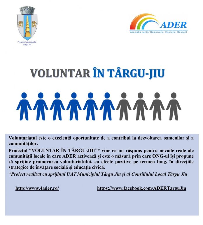 Asociația pentru Democrație Educație Respect derulează în perioada septembrie – decembrie 2022 proiectul „VOLUNTAR ÎN TÂRGU-JIU”.