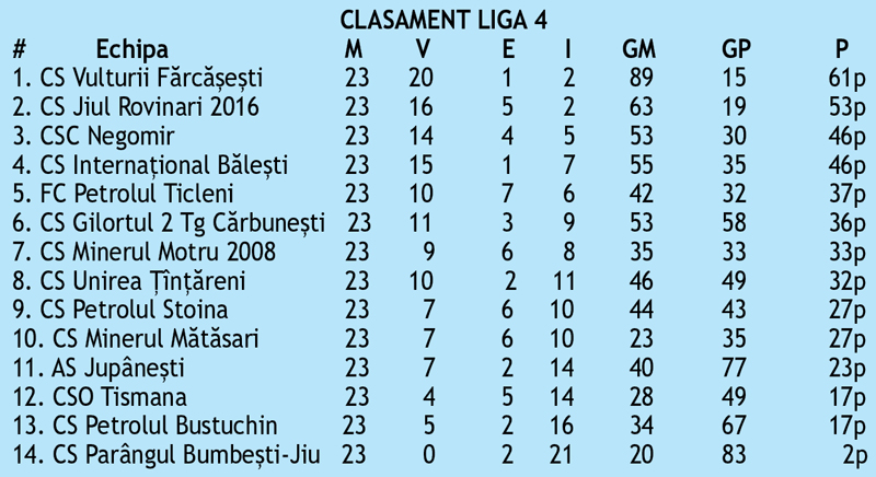 Vulturii Fărcășești sunt tot mai aproape de titlul județean. Cu trei etape înainte de final, fotbaliștii lui Costel Andriucă mai au nevoie de un singur rezultat pozitiv pentru a fi desemnați campionii Gorjului. Liderul nu a avut milă de Minerul Motru în ultima rundă, gazdele reușind un nou succes concludent în campionat. Jiul Rovinari se menține pe locul secund, în timp ce Negomir și Bălești se bat pentru poziția a treia.