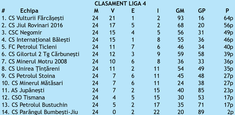 Vulturii Fărcășești este campioana Gorjului și va reprezenta județul la barajul pentru promovare în Liga a 3-a la fotbal. Trupa lui Costel Andriucă este câștigătoarea meritorie a competiției, cu două etape înainte de final. Deși au fost conduși la pauză, oaspeții au obținut succesul care le asigură definitiv primul loc pe terenul formației Petrolul Bustuchin. Un hat-trick al lui Ionuț Berescu și reușita lui Cătălin Rotaru au asigurat un succes concludent pentru vulturi. Antrenorul campioanei se aștepta la această performanță și a vorbit despre viitorul echipei. Angrenat și în fotbalul juvenil, Andriucă nu știe dacă următorul sezon îl va mai prinde la Fărcășești, o echipă cu fani pasionați și o conducere care i-a oferit sprijin. Până atunci, vulturii vor cupa județeană și se gândesc la duelul cu reprezentanta Mehedințiului.