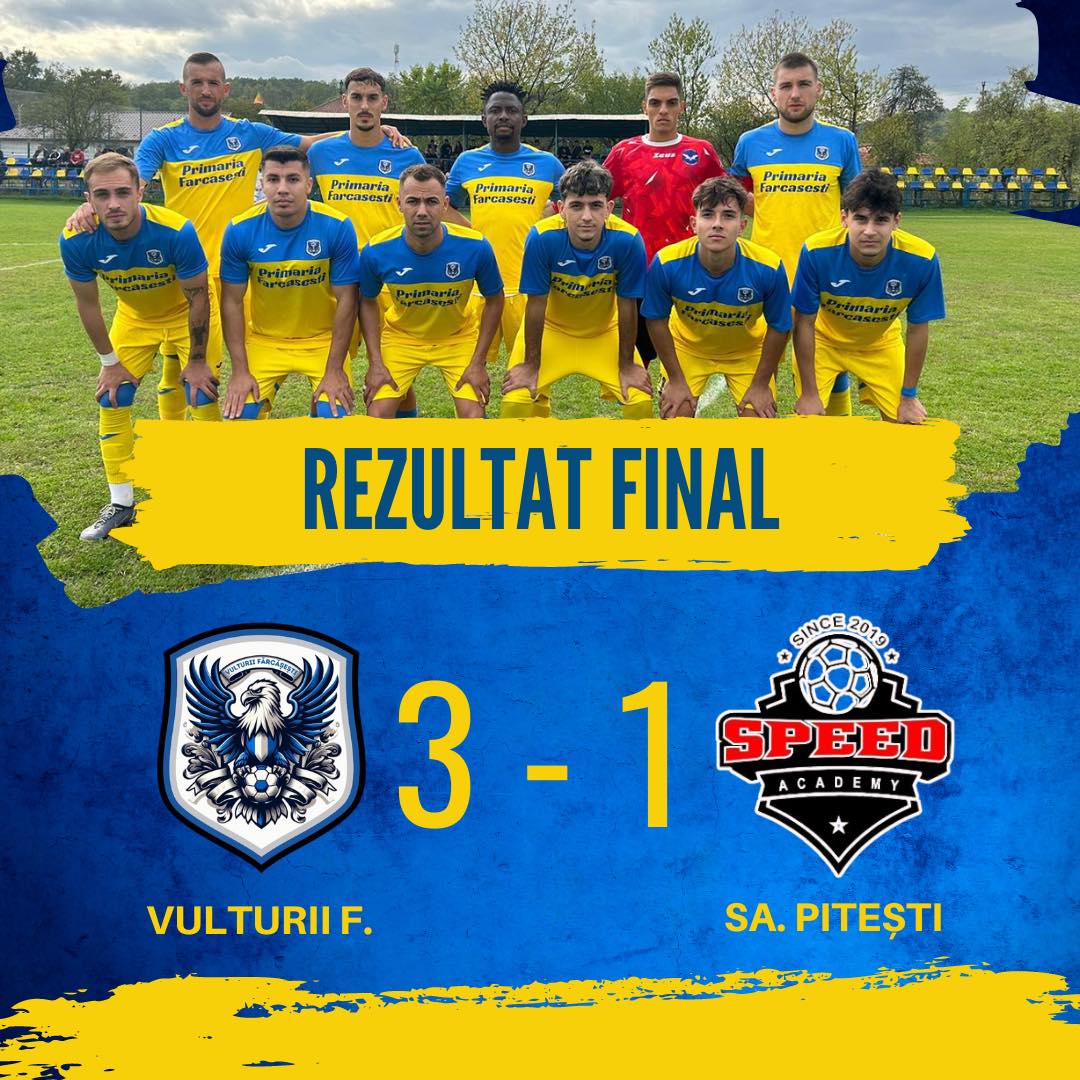 Nou-promovata Vulturii Fărcășești nu are complexe în Liga 3. Formația condusă de Cătălin Bucă a reușit încă un succes pe teren propriu, 3-1 cu ACS Speed Academy Pitești, și rămâne imbatabilă în Gorj. Singurul eșec de până acum a venit în runda trecută, în deplasare, cu liderul SCM Râmnicu Vâlcea. În rest, vulturii au trei victorii și trei remize și închid podiumul după etapa a șaptea a Seriei 8, cu 12 puncte acumulate. Horațiu Peia în prima repriză (`36) și Bogdan Duță (`55) și Ionuț Berescu (`67), în partea a doua, au fost marcatorii gazdelor. Argeșenii au egalat după pauză, dar a fost insuficient pentru noua trupă a lui Alex Bourceanu să reziste la Fărcășești.