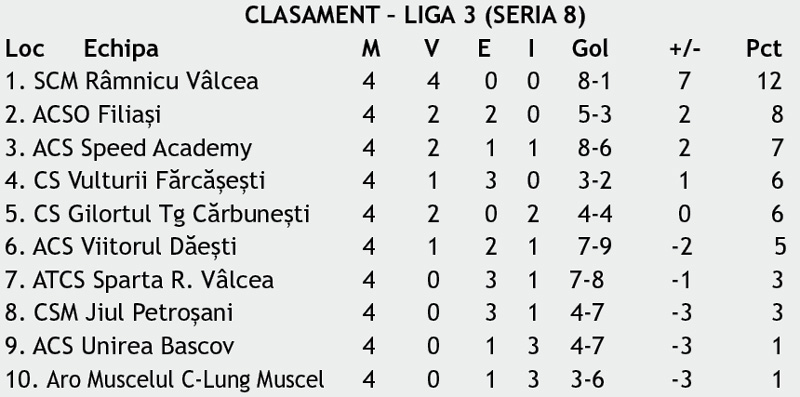 Nou-promovată în Liga 3, Vulturii Fărcășești are un start foarte bun de sezon. După patru runde, elevii lui Cătălin Bucă sunt neînvinși în Seria 8, iar antrenorul principal crede că se putea chiar mai mult. Echipa a acumulat șase puncte, dar tehnicianul este de părere că două remize se puteau transforma ușor în victorii. ,,Suntem neînvinși și îmi felicit jucătorii pentru lucrul acesta și pentru modul cum s-au prezentat și cum au înțeles tot ceea ce le-am cerut eu. Cred că puteam să fim mult mai bine, adică am scăpat printre degete victoria la Horezu în meciul cu Sparta, iar etapa trecută, la Jiul Petroșani, s-a întâmplat același lucru. Ba mai mult, am fost și dezavantajați clar de un penalti acordat gazdelor. Din păcate asta este, sunt arbitri care mai și greșesc. Trebuie să luăm totul ca atare și să ne vedem în continuare de parcursul nostru și să încercăm să strângem cât mai multe puncte”, a spus Bucă. Vineri, la Fărcășești vine cealaltă formație din Gorj, Gilortul Târgu Cărbunești. Antrenorul gazdelor se așteaptă la un meci aprins, dar în limita fair-play-ului.