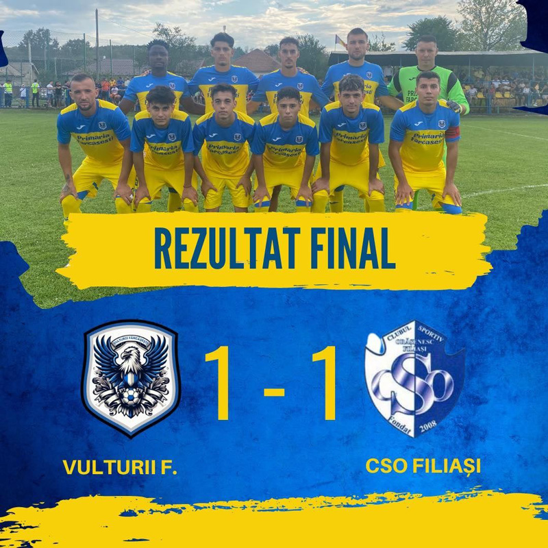 Vulturii Fărcășești a debutat cu dreptul în Liga a 3-a. Cu tribunele pline, gazdele au ținut piept formației CSO Filiași, 1-1, în primul meci din istorie al gorjenilor în acest eșalon. Rogoveanu i-a adus pe vizitatori în avantaj încă din minutul 8, dar Berescu a egalat situația în partea secundă (`77). Antrenorul Cătălin Bucă a fost mulțumit la finalul jocului. A declarat că pentru o echipă nou-promovată orice punct este important.