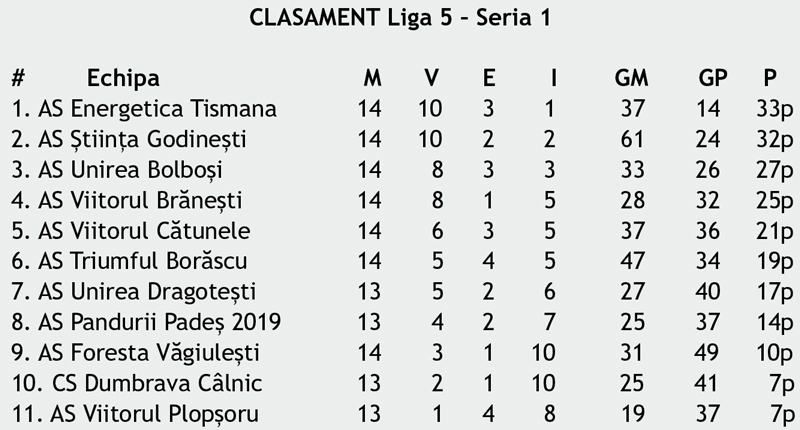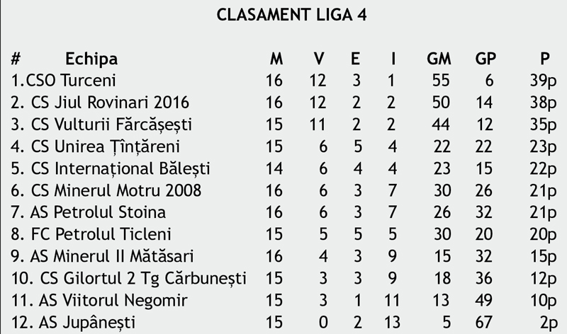 S-a schimbat din nou liderul în Liga 4. Vulturii Fărcășești a reușit un succes foarte important în runda cu numărul 18. Formația pregătită de Daniel Bălașa a învins-o pe Jiul Rovinari. Ionuț Berescu a reușit ,,dubla” care a dus echipa sa la doar trei puncte de locul doi, dar cu un meci mai puțin disputat. Rezultatul a ajutat-o pe CSO Turceni să-și ,,recupereze” prima poziție în clasament, după victoria de la Mătăsari. Motru și Țînțăreni au oferit singura remiză a rundei. Energetica Tismana și CSC Dănești conduc cele două serii din Liga 5. Cel mai ,,bogat” meci în goluri a fost consemnat la Prigoria, unde s-a marcat de 13 ori!