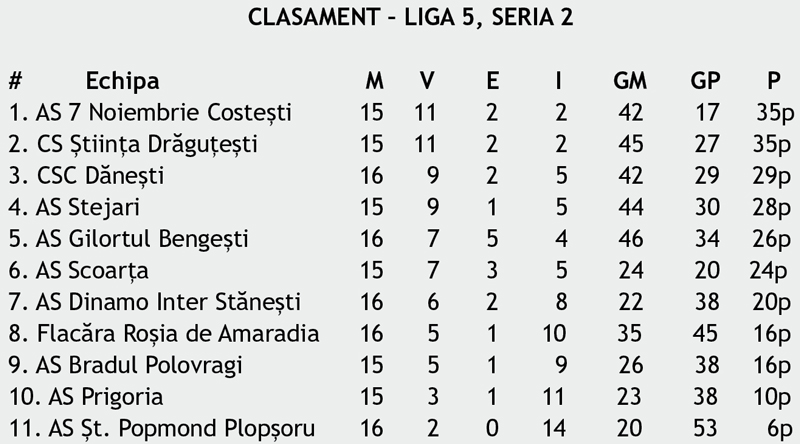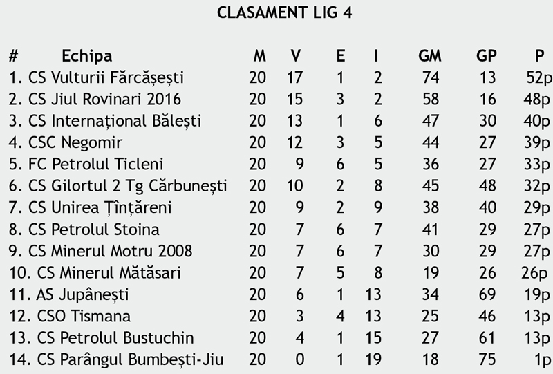 Vulturii Fărcășești a obținut un nou succes concludent în acest weekend. Liderul gorjean din Liga 4 a trecut fără probleme de Minerul, pe terenul de la Mătăsari. Singura echipă care încearcă să țină pasul este Jiul Rovinari. Şi formația lui Ion Lițoiu a câștigat categoric duelul cu Jupânești. În schimb, trupa din Negomir a învins-o pe Internațional Bălești și țintește locul trei. Triumful Borăscu este lider solitar în Seria 1 a Ligii 5, în timp ce Știința Drăguțești a egalat-o la puncte pe AS 7 Noiembrie Costești în Seria 2.
