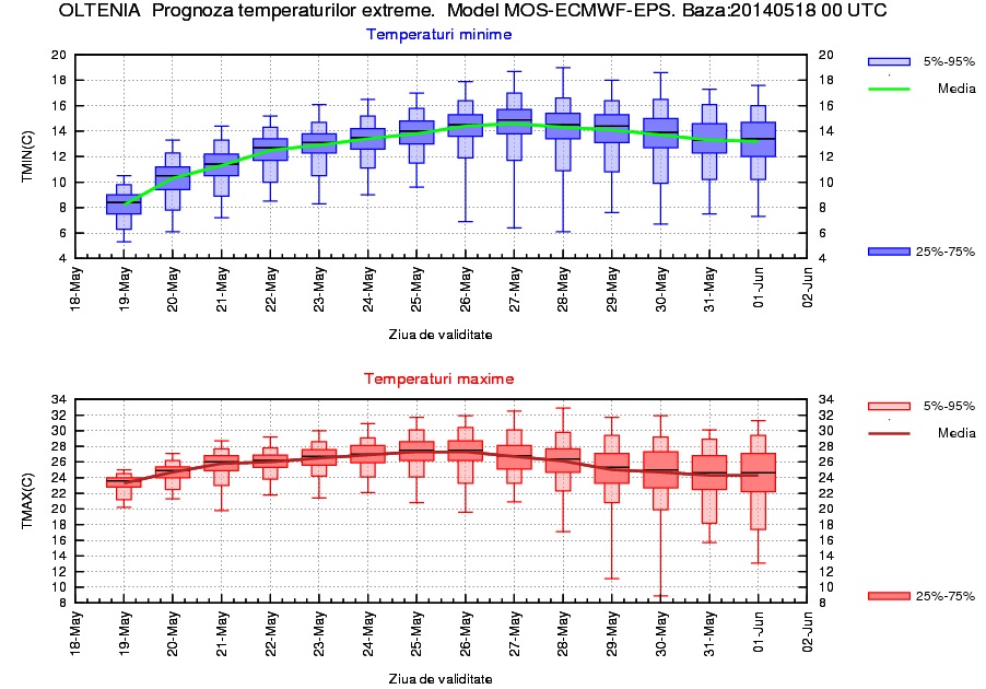 La începutul primei săptămâni de prognoză vor fi medii ale maximelor diurne de aproximativ 14 grade şi ale minimelor nocturne de 3 grade Celsius, pentru ca după data de 22 mai, treptat, temperaturile să crească, spre 17 -18 grade ziua, iar noaptea spre valori situate, în general, între 8 şi 10 grade, vremea urmând să devină caldă.