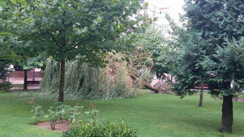 Sfârșitul săptămânii trecute a fost unul cât se poate de capricios în Gorj, dar mai ales la Târgu-Jiu. Ziua de sâmbătă a fost marcată de temperaturi extrem de ridicate în prima parte pentru ca, după-amiază, o furtună puternică să trimită la plimbare soarele de pe cer. Până în jurul orei 15.00, termometrele stradale din municipiu arătau chiar și 40 de grade, oamenii căutând locurile răcoroase sau băncile din apropierea fântânilor arteziene pentru a se mai răcori. După ora amintită lucrurile s-au schimbat brusc și în scurt timp s-a produs o furtună, deși județul era până atunci sub cod galben de caniculă. Codul a fost înlocuit cu unul pentru furtună, iar avertismentele meteorologilor s-au adeverit din plin pentru că în oraș a plouat abundent. Apa pe străzi s-a adunat și de o palmă, fără să fie însă probleme majore în trafic. Gurile de canalizare nu au putut prelua imediat tot debitul, dar problema s-a rezolvat de la sine, în timp. Mai grav a fost că vântul care a însoțit ploaia a doborât câțiva arbori din zona centrală, dar și un acoperiș.