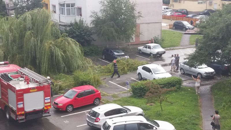 Trei autoturisme au fost avariate de bucățile de tablă sau de crengile copacilor puși la pământ. Din fericire, nu au fost persoane rănite în incidentele respective. Pompierii au intervenit pentru a îndepărta arborii căzuți pe carosabil și pe mașini, acum șoferii fiind buni de plată pentru că nu aveau asigurare CASCO. Cel mai grav a fost avariată o mașină înmatriculată la Mehedinți, un județ grav afectat de lipsa precipitațiilor, incendiile de vegetație uscată fiind acolo la ordinea zilei tocmai pentru că nu a plouat de mult timp.