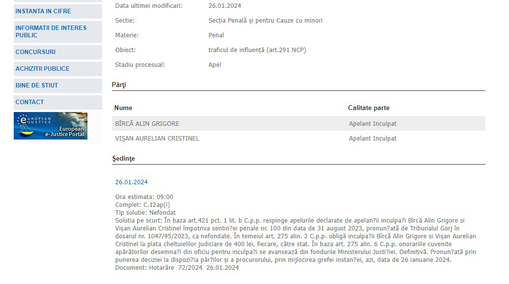 Curtea de Apel Craiova a menținut vineri, 26 ianuarie, sentința dată în vară de Tribunalul Gorj, respingând, ca nefondate, apelurile celor doi inculpați care au cerut pedepse mult mai mici.