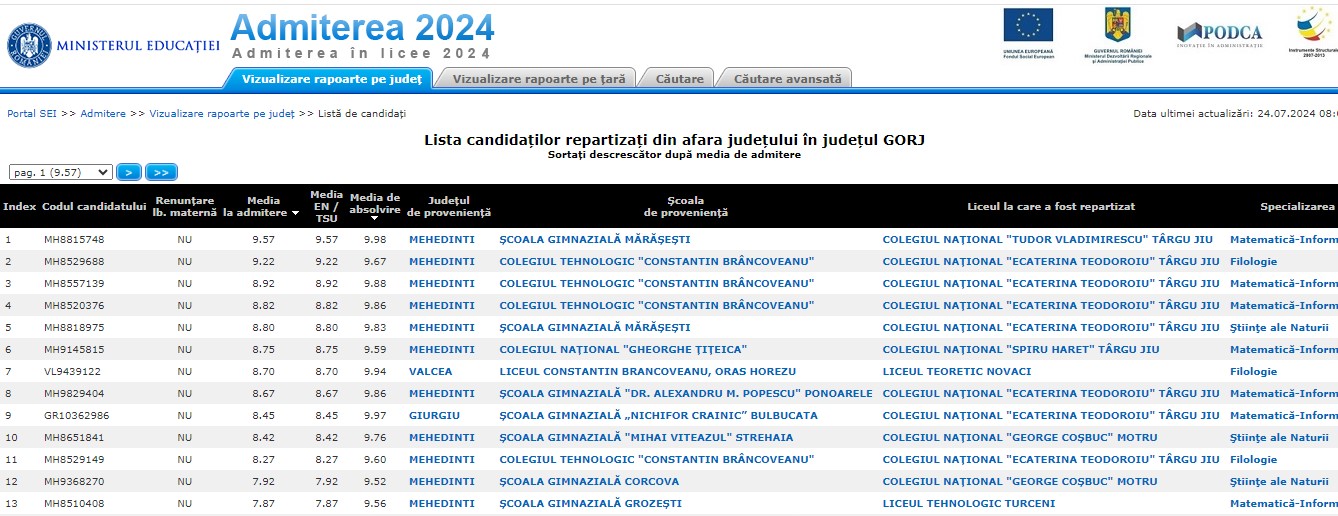 Elevii repartizați computerizat în liceele din Gorj provin de la școli din județele Mehedinți, Vâlcea, Dolj, Olt, Hunedoara, Caraș-Severin și Giurgiu. În total este vorba despre 81 de absolvenți de gimnaziu.