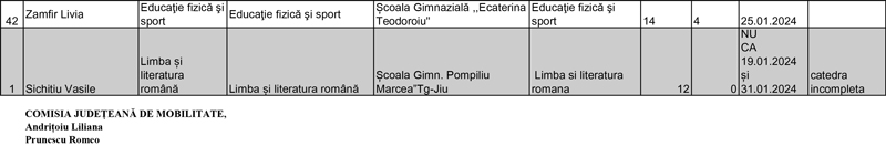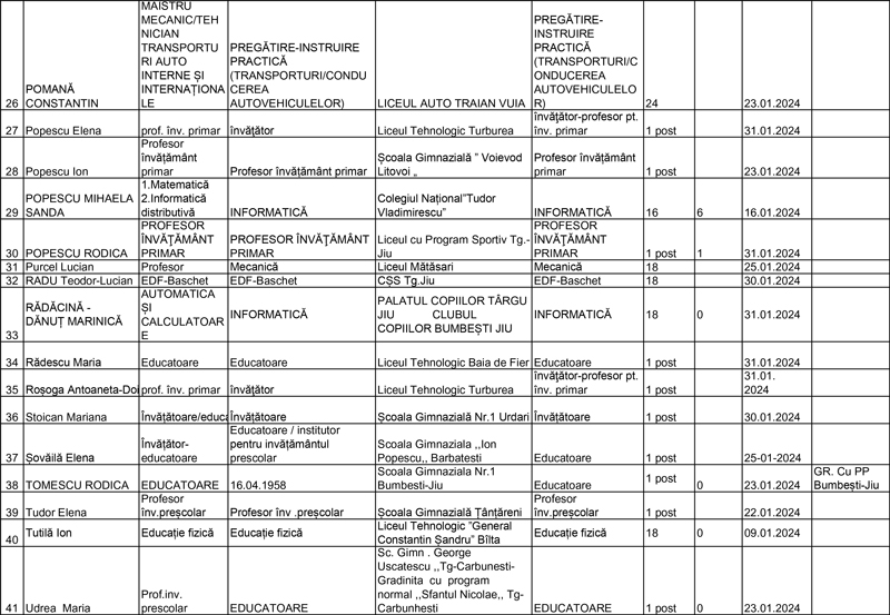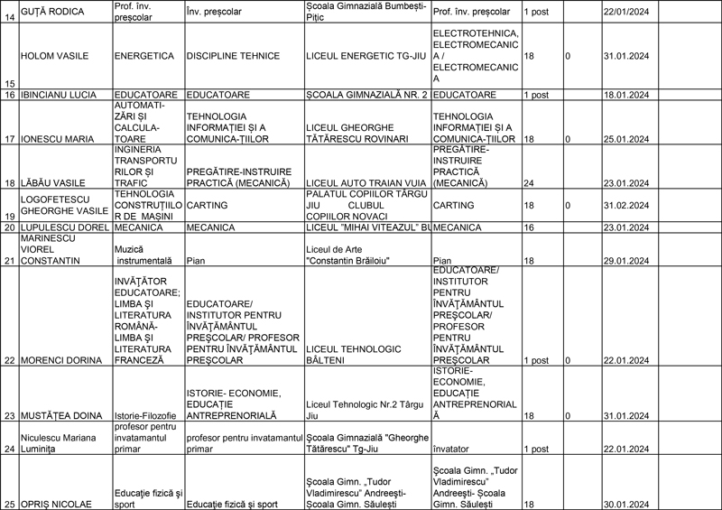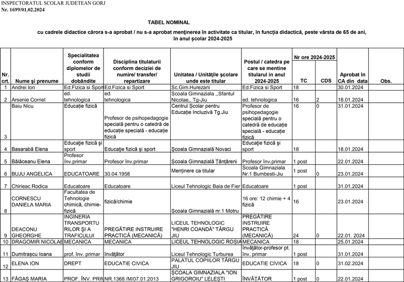 În total, 43 de cadre didactice au solicitat menținerea în activitate ca titular peste vârsta de pensionare de 65 de ani. Cererile au fost aprobate mai întâi în Consiliile de administrație ale unităților de învățământ. Lista finală a fost validată de ISJ Gorj. Cele mai multe solicitări au venit din partea educatoarelor și învățătoarelor. Pe listă se mai găsesc profesori de tehnologii, de educație fizică și sport, informatică sau fizică-chimie. Unui singur profesor, de limba și literatura română, nu i s-a aprobat cererea. Motivul: catedră incompletă pentru anul 2024-2025.