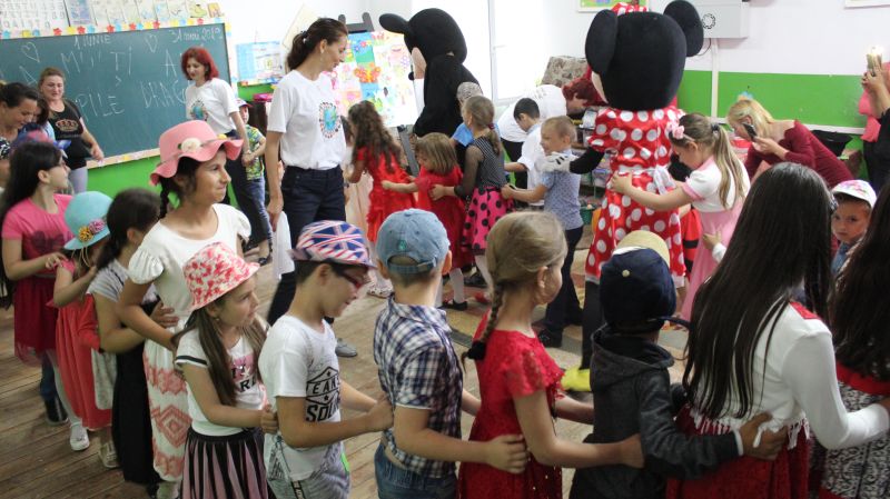 Alături de copii au fost şi îndrăgitele personaje Mickey şi Minnie care au dansat şi au cântat împreună cu aceştia pe parcursul întregii activităţi. La această activitate au fost prezenţi şi părinţii, care împreună cu cadrele didactice: Dragotoiu Maria, Giurgescu Ramona, Curelea Anica-Adriana, cursanţii şi conducerea Şcolii Postliceale Sanitare Omenia, au pregătit un moment festiv în care copiii au primit un tort de ziua lor, bucurie de care unii dintre copii nu au avut niciodată parte.